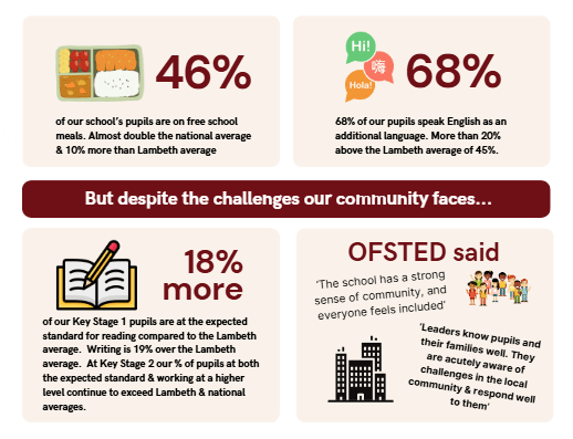 Just 1% of our pupils are White British. We have has a high proportion of pupils who would be eligible to receive free school meals, and who speak English as a second language and are not yet proficient in English. More than the Lambeth average school. Many of our children live on the Brandon estate – shockingly dubbed ‘the deadliest estate in Britain’ by the national press in 2018 after a spate of gang violence. Headlines in 2019 called it an ‘estate of broken promises‘.